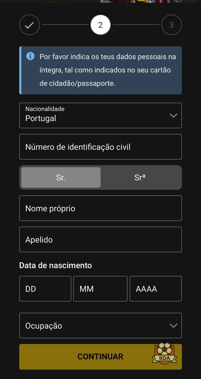 3. Insere informações como nacionalidade, número de identificação civil, nome próprio, apelido, data de nascimento, ocupação e clica em “Continuar”.