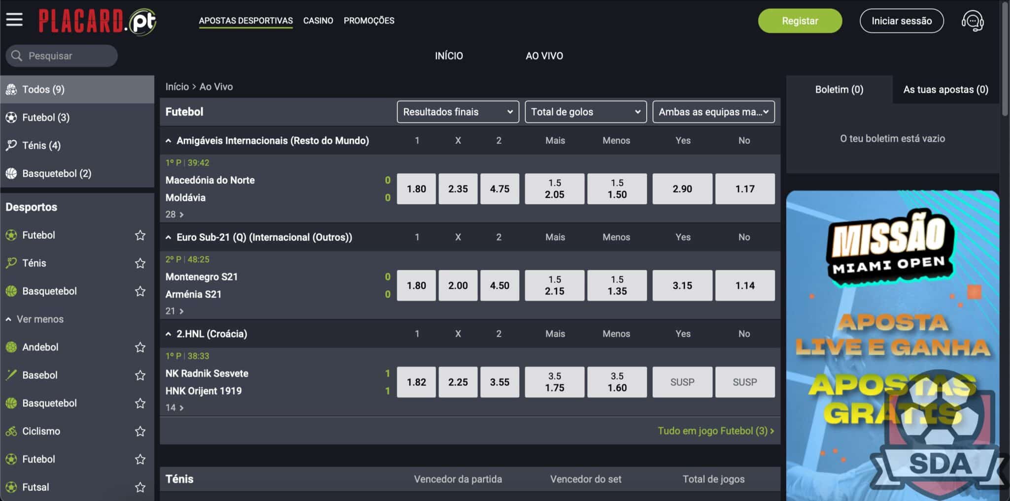 Um dos fatores mais determinantes ao escolher uma casa de apostas desportivas é a oferta de diferentes modalidades desportivas e mercados de apostas. O Placard.pt disponibiliza todos os desportos mais populares entre os portugueses, com um foco natural em futebol , basquetebol, ténis e futsal.